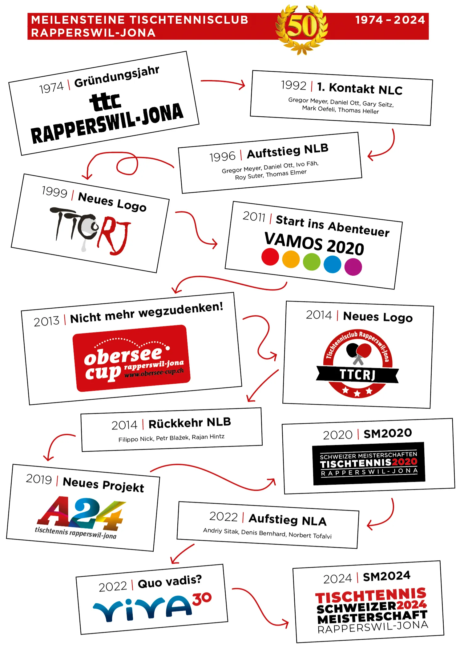 Depuis sa création le 16 septembre 1974, beaucoup d’histoire a été écrite. Le projet VAMOS2020 (initiateur Marc Schwitter) a permis de mettre en place la structure qui caractérise aujourd’hui le TTCRJ. Avec A24, on a atteint l’objectif tant attendu de jouer avec les meilleurs de Suisse et on a trouvé une salle d’entraînement avec la House of Table Tennis.